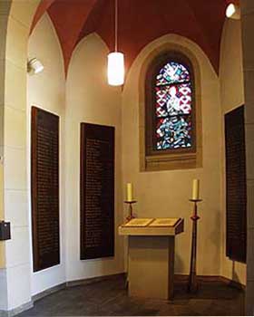 Totenbuch und Tafeln mit den Gefallenen der Gemeinde, darüber das Fenster mit der Taufe Jesu